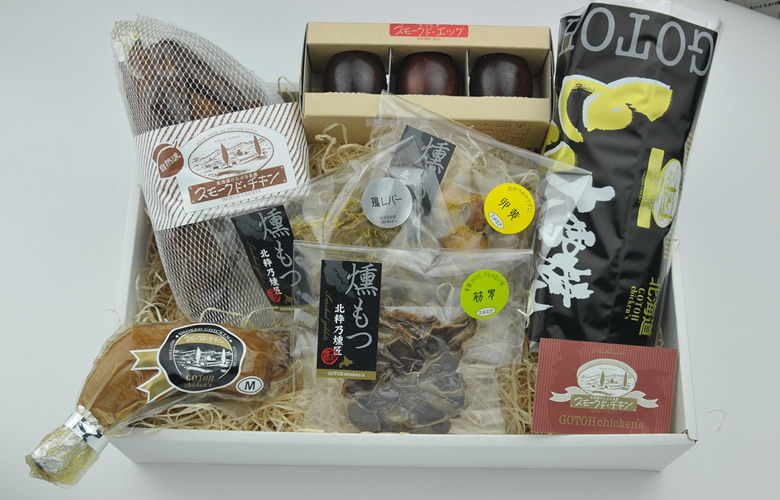 剣淵の厳しい冬に磨き育まれた地養鶏(ヨード鶏)を使ったくんせい、肉、卵、内蔵のくんせい各種。合成保存料や着色料を使わず昔ながらの燻煙法なので、素材の旨味が充分に活きていて、しかもヘルシーです。ギフトセットもあります。