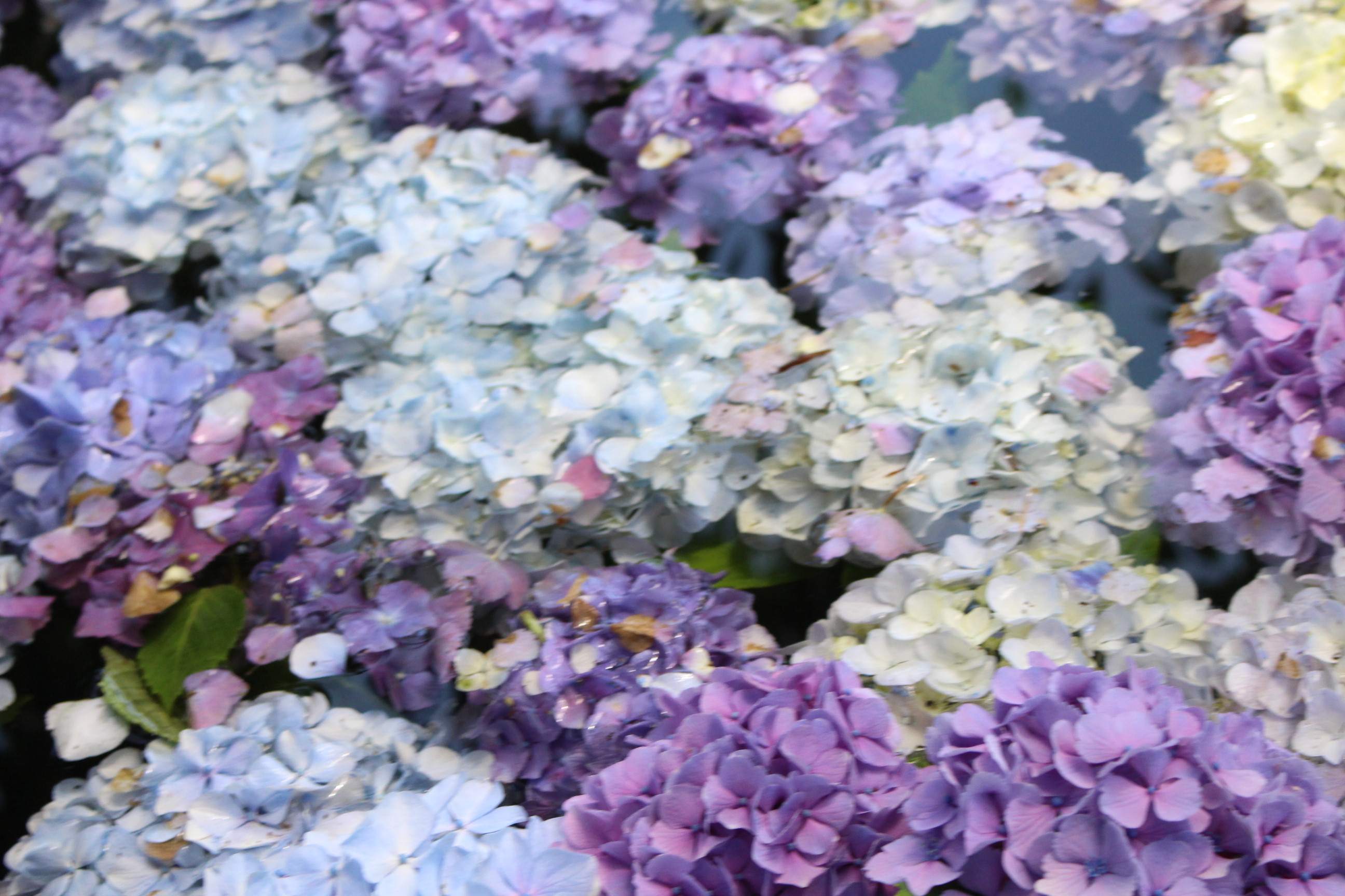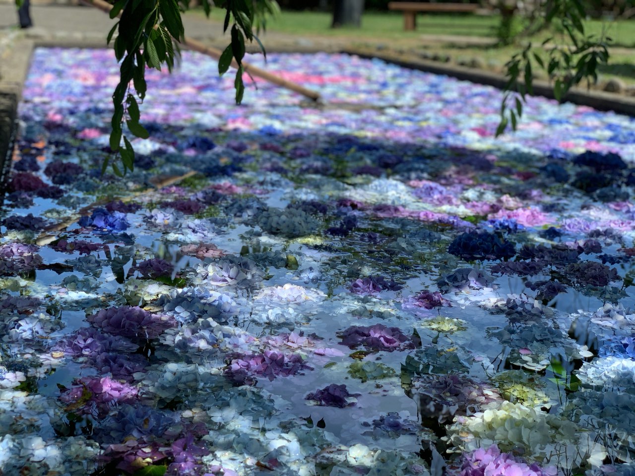 夏の松前を彩る松前藩屋敷“浮き紫陽花”は、松前公園内にある約2千株の紫陽花の花弁、3千弁を松前藩屋敷内にある水路に浮かべたものである。