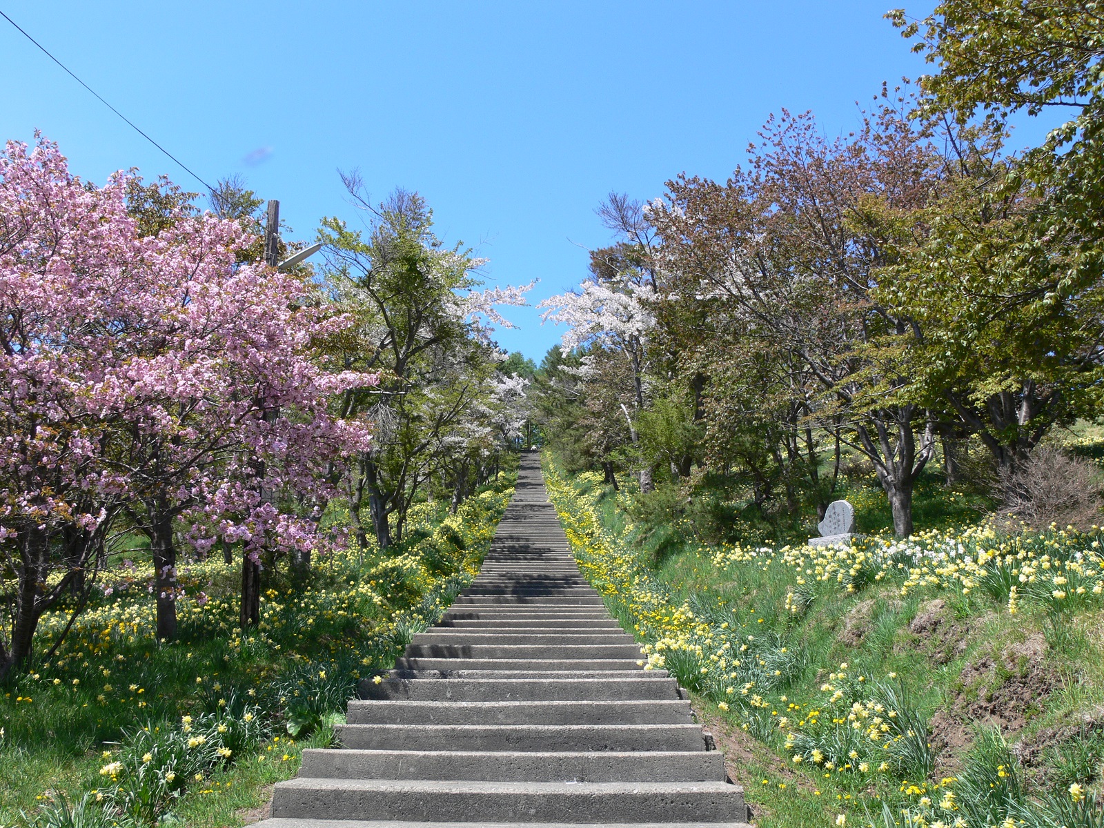 せたな町花の「水仙」の名所で玉川神社を中心に広がり、豊かな水田風景や遊楽部岳を望める小高い丘(標高約80m)に位置する公園。約30種・約30万株が植えられている「水仙広場」の見ごろは4月下旬~5月中旬。タイミングが合えば、水仙と桜のコントラストが楽しめる。約7haの広い敷地には、ブナ、カシワなどの広葉樹林、スギ、カラマツの人工林が生育しており、秋は紅葉狩りも楽しむことが出来る。玉川神社は旧会津藩の名士で、北檜山区開拓の祖・丹羽五郎が明治25(1892)年に「坂上苅田麻呂命」を祀り建立し、現在の社殿は昭和16(1941)年7月に秋田檜材で改築されたもの。かつて樹齢400年のブナの巨木が神木として鎮座していたが落雷のため消失。平成13(2001)年会津藩ゆかりの土師神社の神木の分霊が神木として記念植樹された。拝殿後は北檜山区の『真駒内神社』で御朱印を頂くことが出来る。