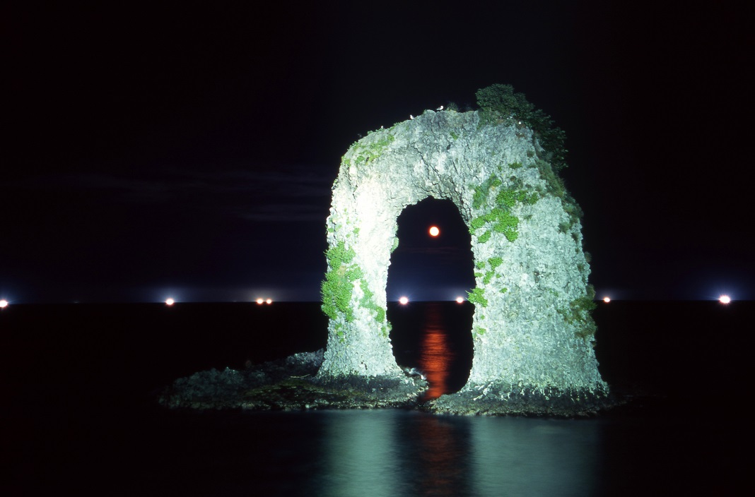 夜明けには朝日が岩を照らし、夜間(夏期:18時~22時 冬季:17時~21時)はライトアップされ暗い海に浮かび上がります。さらに漁の時期は漁火とともにより幻想的な風景を見せてくれます。