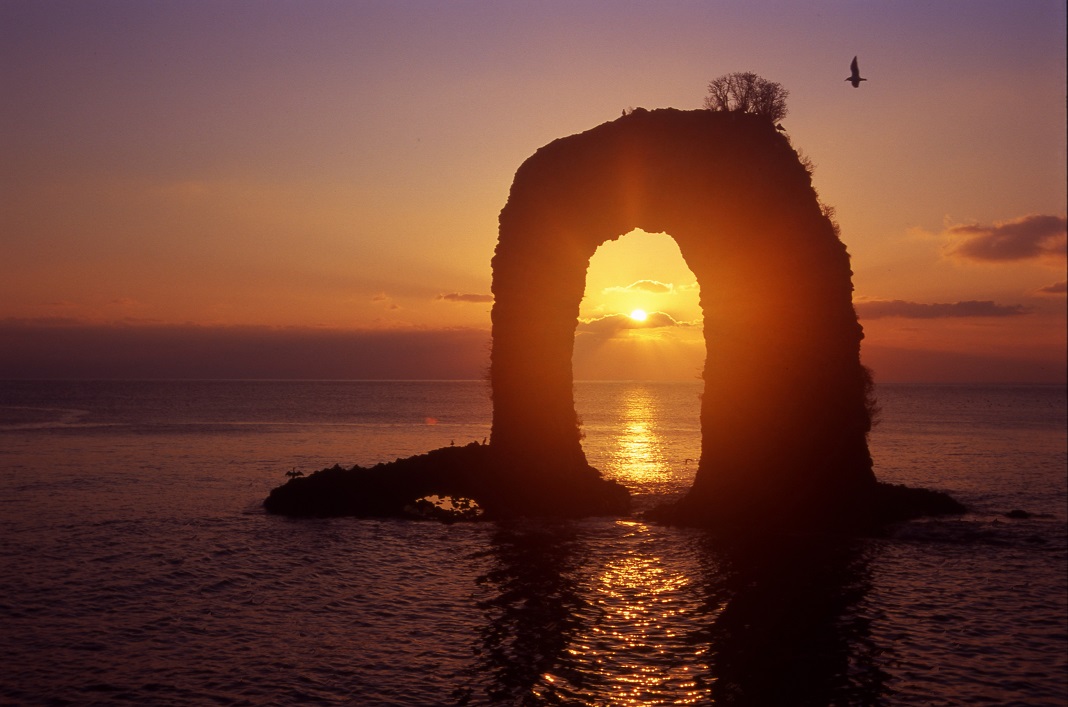 フェリーで奥尻島に到着する直前に進行方向左手の窓から目に入るのが奥尻島のシンボルであるなべつる岩。この岩は中心が自然浸食により空洞になっています。鍋の取っ手(つる)に似ているのが名前の由来で高さは19.5メートルあります。